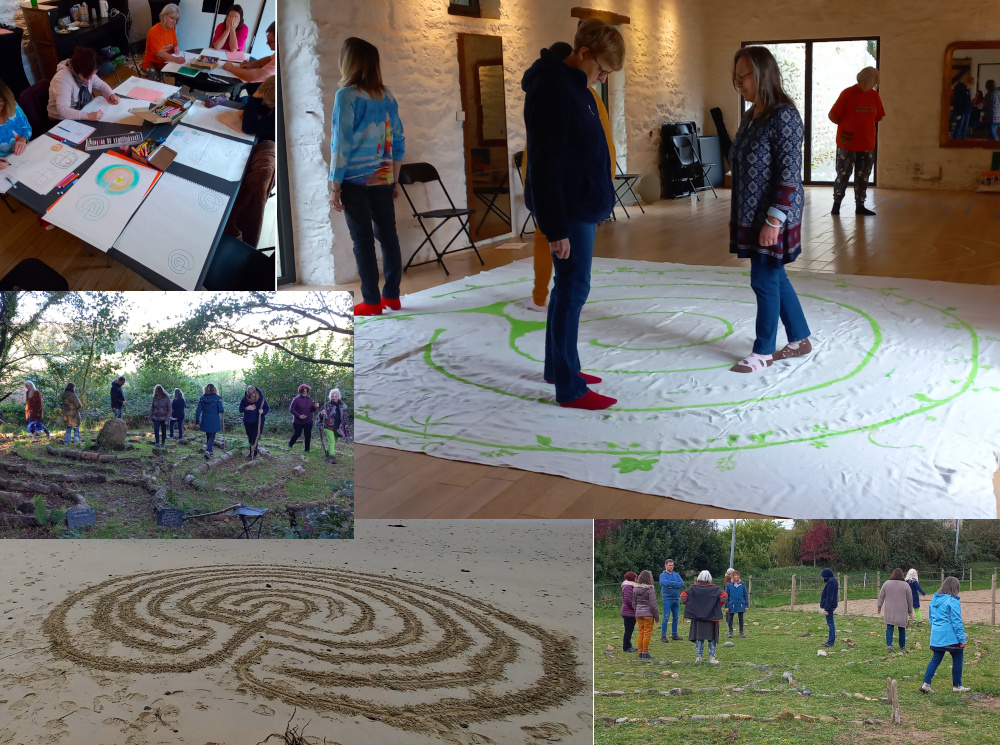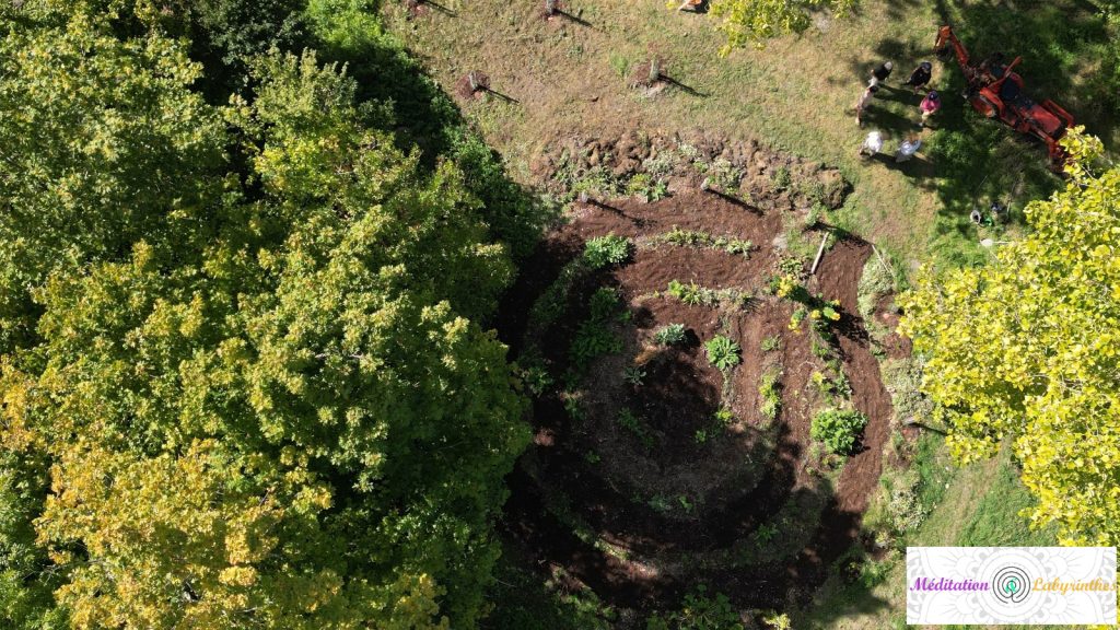 Prés du lieu du stage, j’ai réalisé un labyrinthe à 3 circonvolutions et 1 labyrinthe à 5 circonvolutions et un 7 est prévu pour le stage. Ces labyrinthes ont été créés au sein d’un projet collectif de forêt-jardin, de quoi mettre de bonnes ondes !